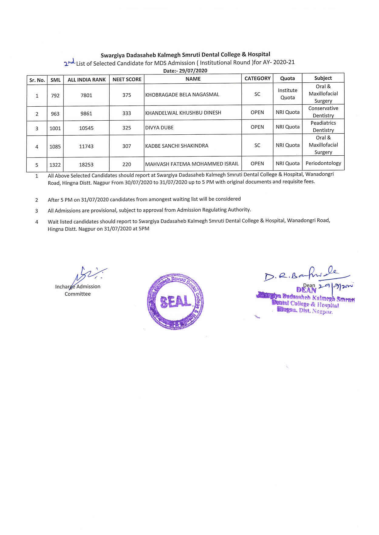 SELECTION LIST II OF CANDIDATES IN INSTITUTIONAL ROUND FOR NEET MDS 202021 on 29/07/2020